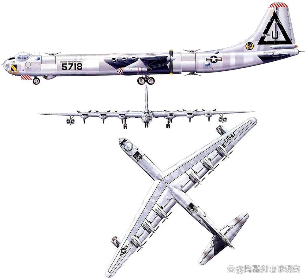 B-36“和平缔造者”,由康维尔公司研发生产,采用活塞发动机和涡喷发动机的混合推进方式,也是历史上最大的量产型活塞发动机飞机。该机(B-36J)全长49.42米,翼展70.12米,空重75.53吨,最大起飞重量186吨,动力装置包括4台通用电气J47涡喷发动机和6台普惠R-4360-41活塞发动机,最大速度672公里/小时,转场航程16000公里,作战半径6415公里,最大载弹量39吨。B-36轰炸机生产时间是1946年到1954年,总产量384架。